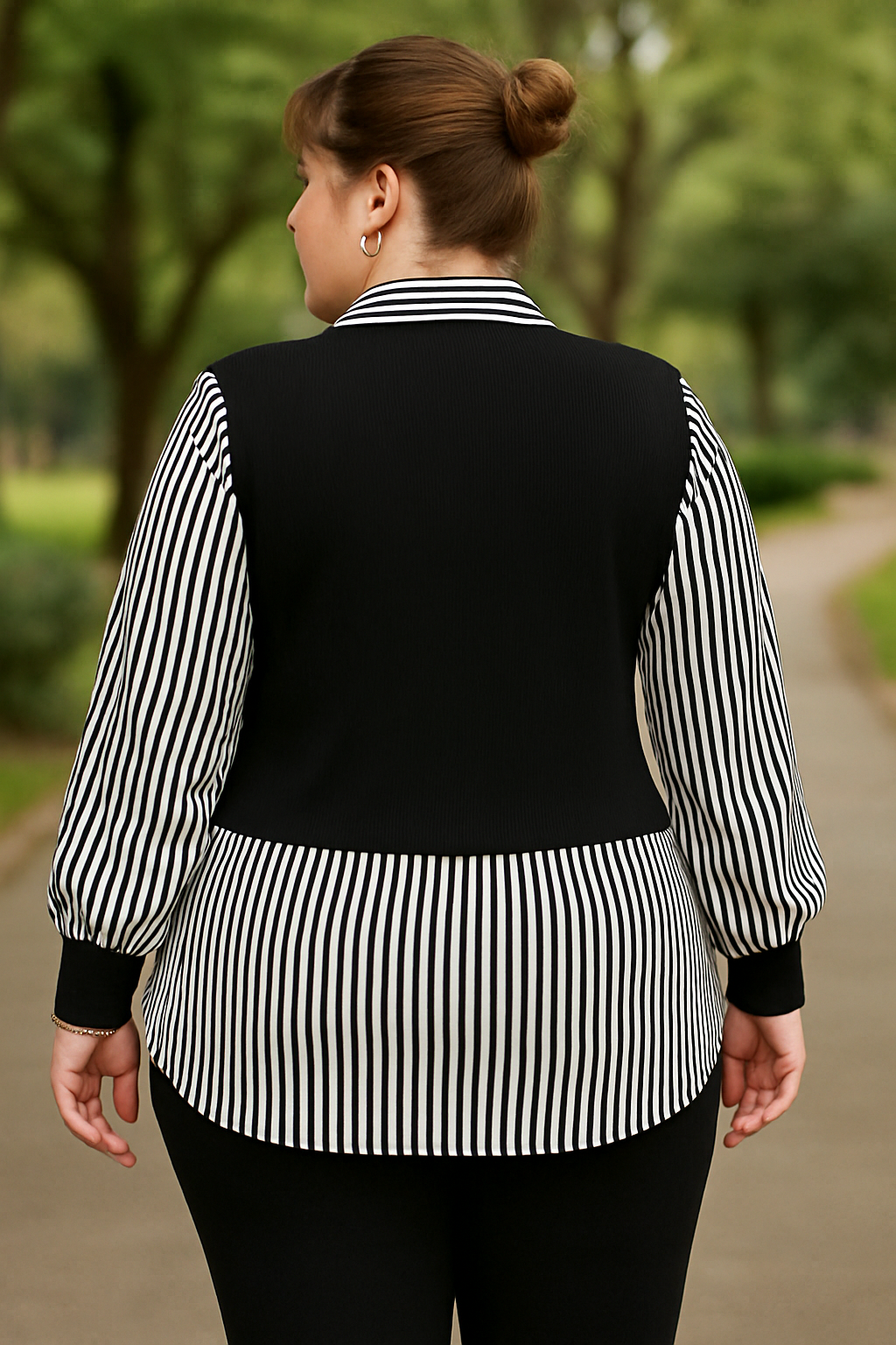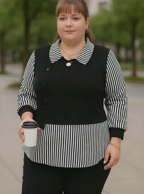 Hľadáš kúsok, ktorý pôsobí štýlovo, zakryje, čo má, a zároveň zvýrazní tvoju ženskosť? Táto čiernobiela tunika s efektom vrstvenia je presne pre teba! 🖤🤍