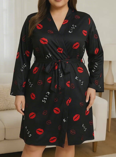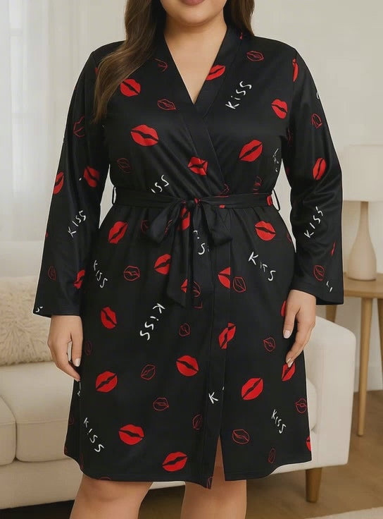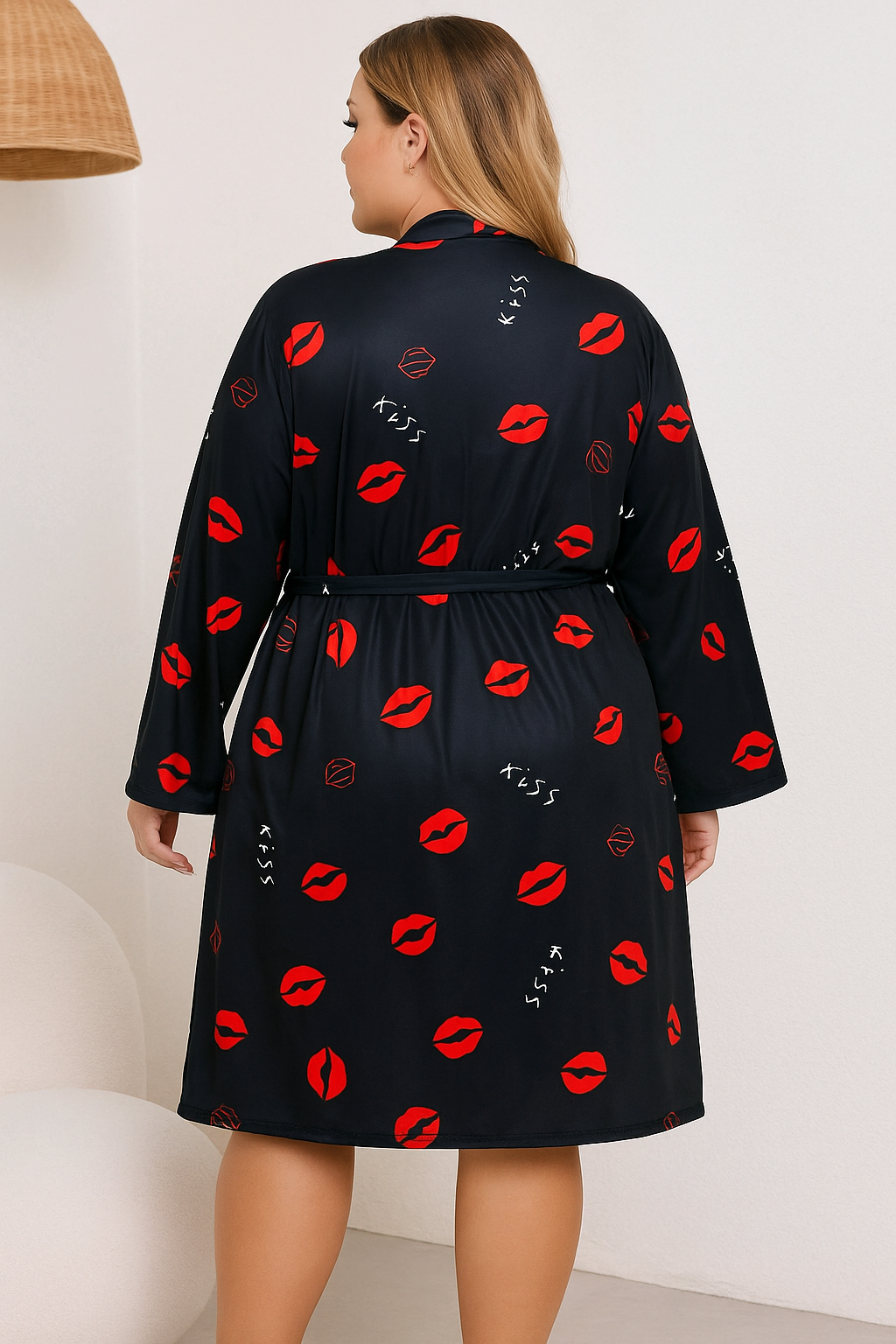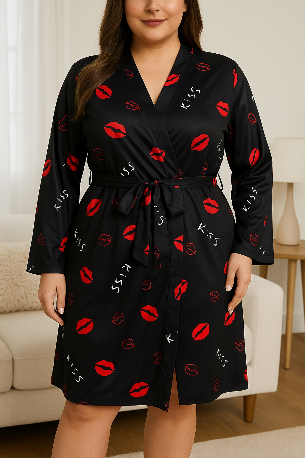 Zahaľte sa do luxusu a hravosti.💋 Tento čierny župan s výraznou potlačou červených bozkov a nápisom „Kiss“ je dokonalým spojením zvodnosti a pohodlia. Ľahučký materiál príjemne chladí na pokožke a zaväzovanie v páse zvýrazní vašu siluetu. Ideálny na večerný relax aj ranné prebudenie so štýlom.